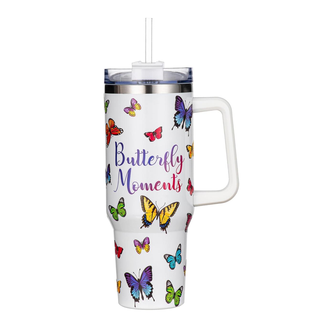 Cestovní hrnky do kuchyně a zábavy | Hrnek Plow & Hearth Butterfly Moments Canyon, dvoustěnný nerezový hrnek s brčkem, 122 g, dárková krabička