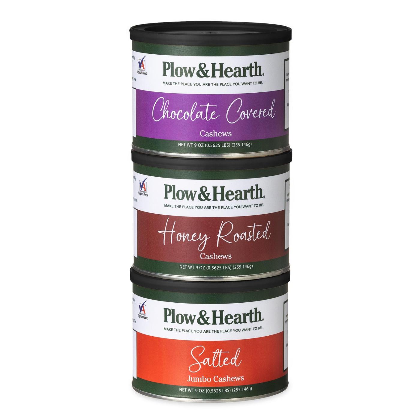 Gurmánské občerstvení a ořechy do kuchyně a zábavy | Dárková sada kešu ořechů Plow & Hearth: solené, medem opečené a čokoládou obalené kešu ořechy