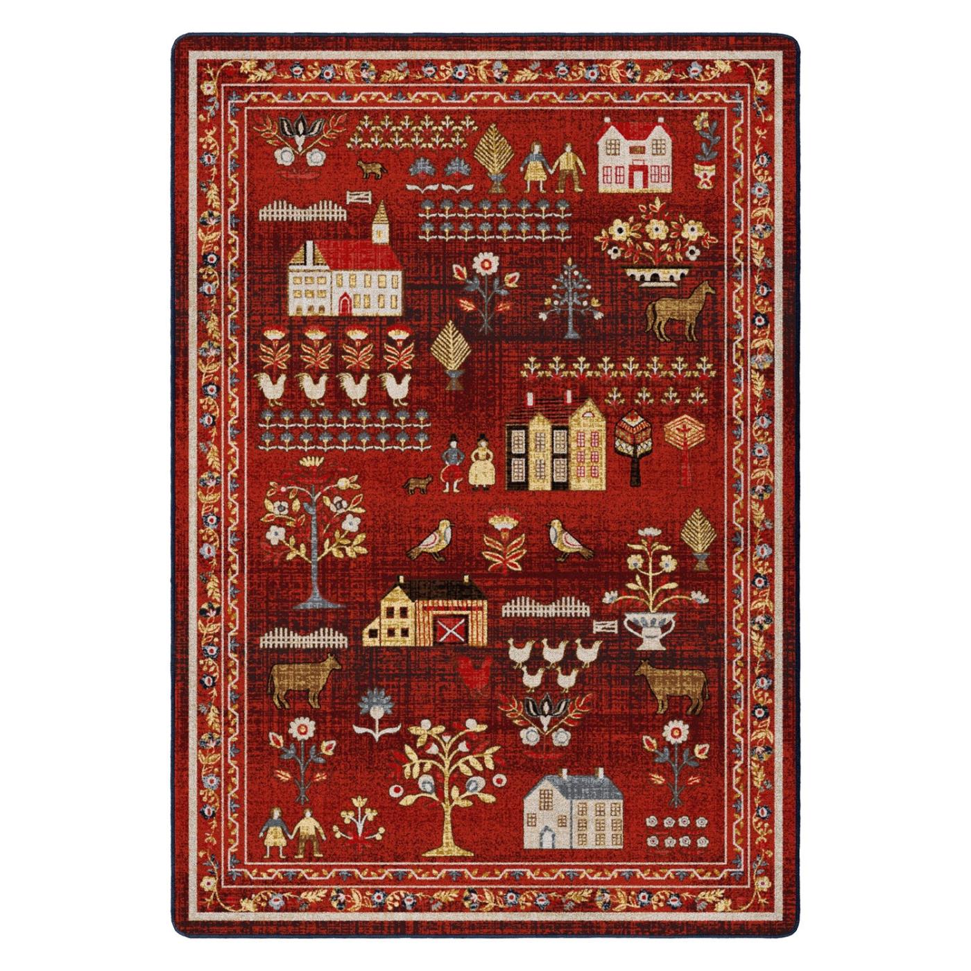 Unikátní design koberce je novým pohledem na nadčasovou vesnici Shaker s domy ze solných bloků, kostelem a stodolou spolu s lidmi a zvířaty, která tam žijí. Tento koberec je perfektní kulisou pro farmářský, tradiční nebo přechodný dekor.