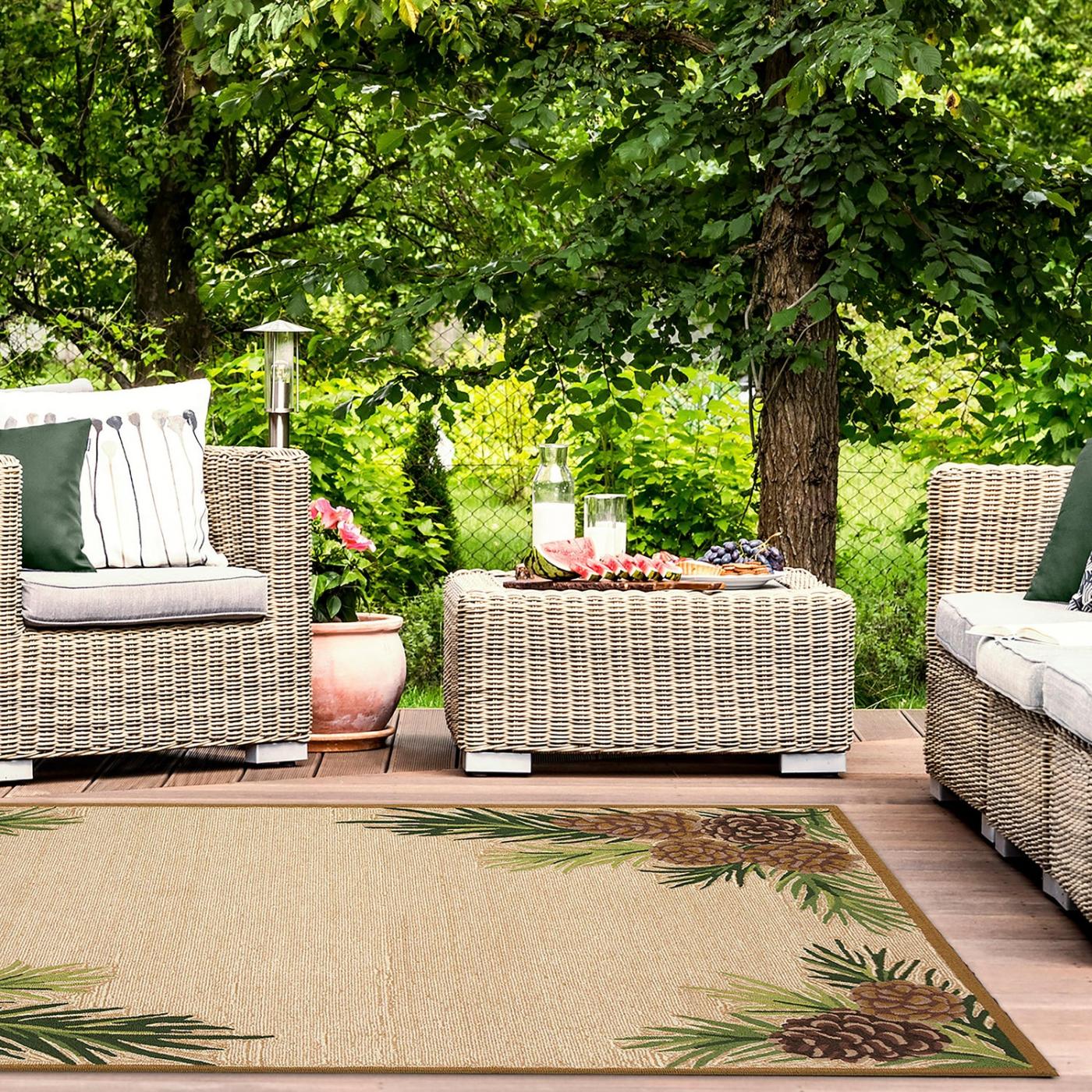 Tento koberec s majestátními borovými šiškami v ručně háčkovaném stylu promění jakýkoli prostor v rustikální útočiště. Bohaté, zemité tóny a poutavý design vnášejí lesní styl do obývacího pokoje, ložnice, pracovny nebo útulné chaty a jsou odolné, aby odolaly venkovním živlům na terase, verandě, zimní zahradě nebo palubě.