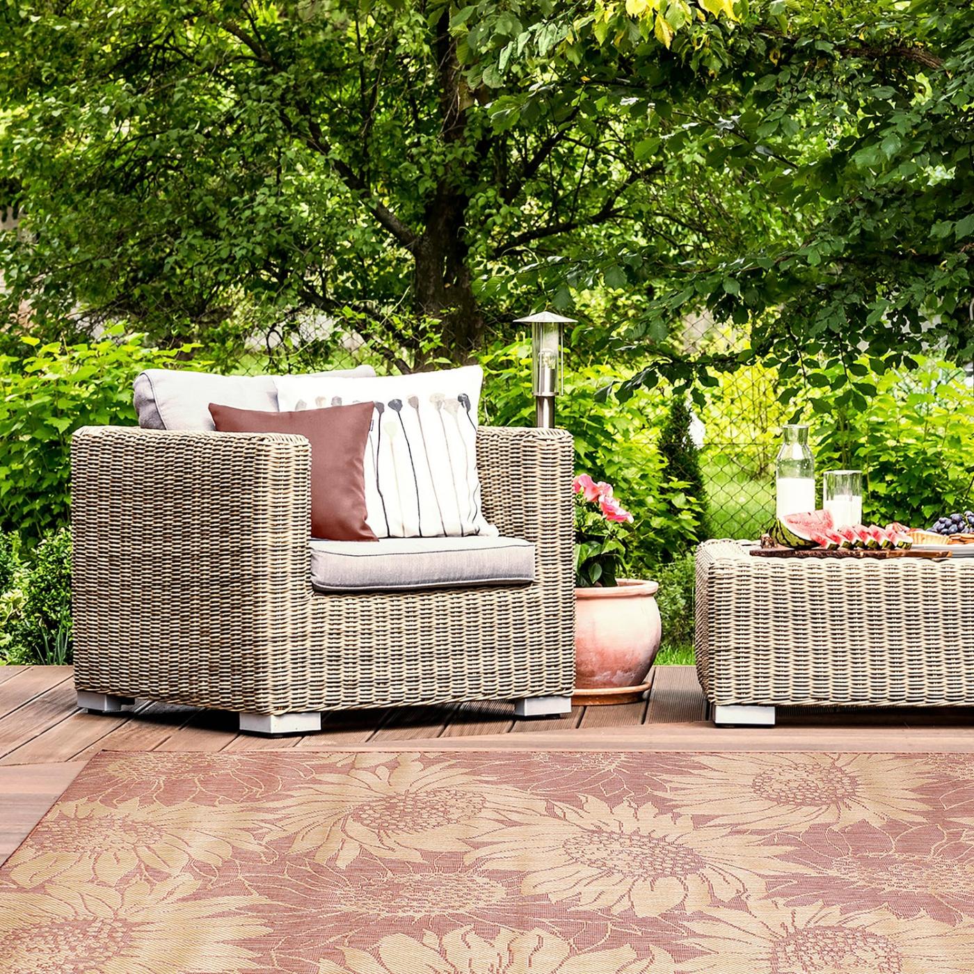S tímto zářivým, kvetoucím kobercem s motivem slunečnic do interiéru i exteriéru rozjasněte a rozveselíte jakýkoli prostor. Zamilujete si vzhled, cenu a odolnost. Tento koberec do interiéru i exteriéru má krásu a měkkost tradičního vlasového koberce, ale je vyroben ze 100% polypropylenu, aby odolal vysokému zatížení uvnitř i venku.