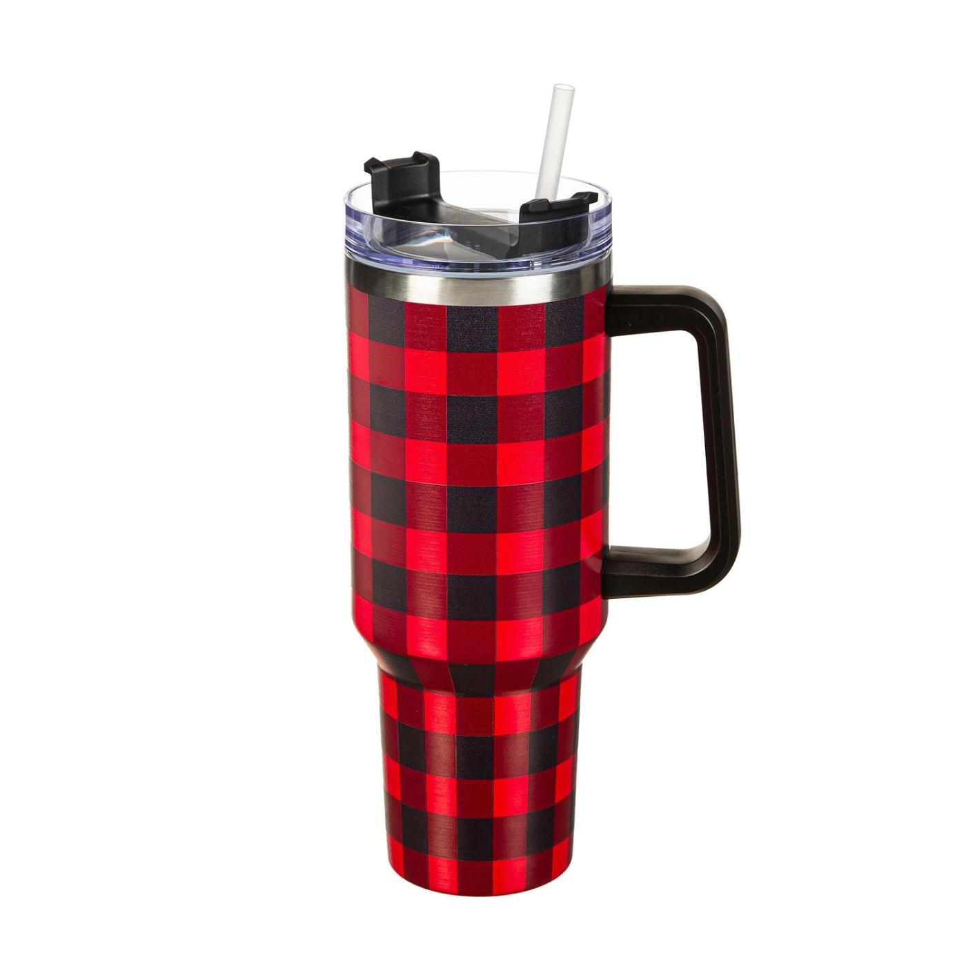 Cestovní hrnky do kuchyně a zábavy | Hrnek Plow & Hearth Red Buffalo Check Canyon, dvojitá stěna z nerezové oceli s brčkem, 122 g, dárková krabička