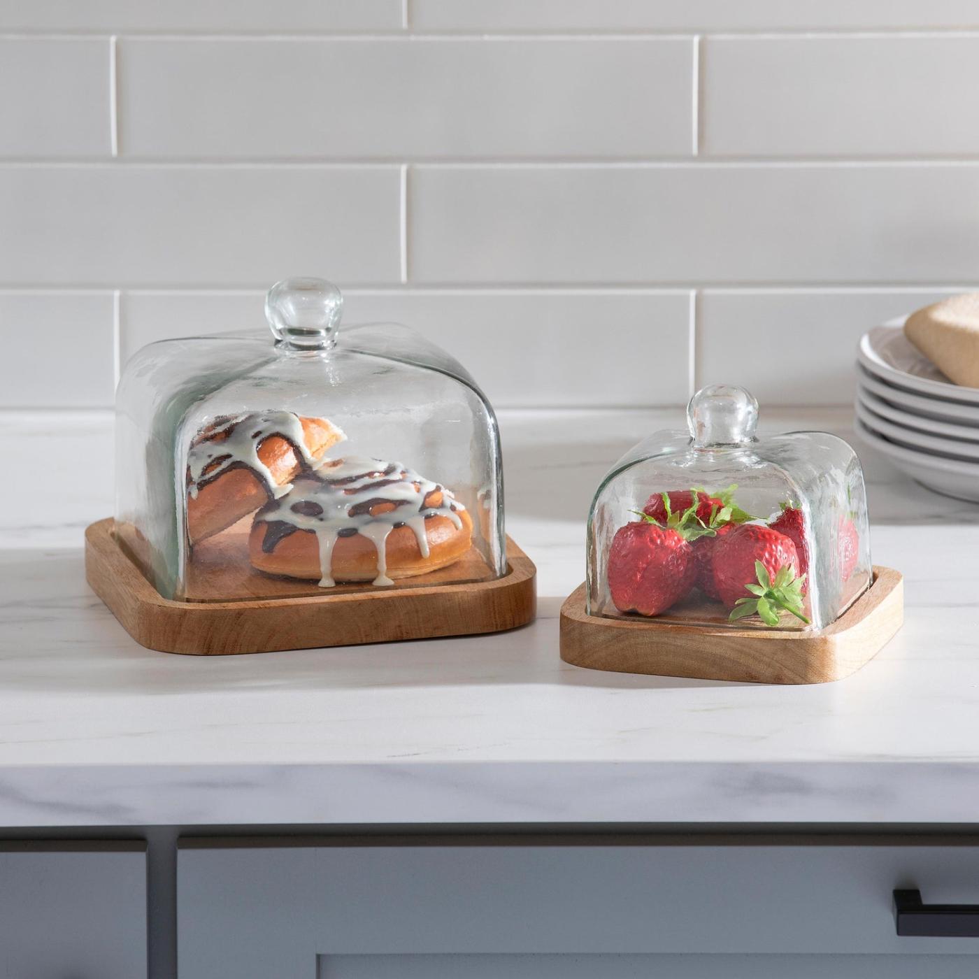 Kuchyňské a zábavní servírovací nádobí | Dřevěné servírovací talíře Plow & Hearth se skleněnými kopulemi, sada 2 kusů