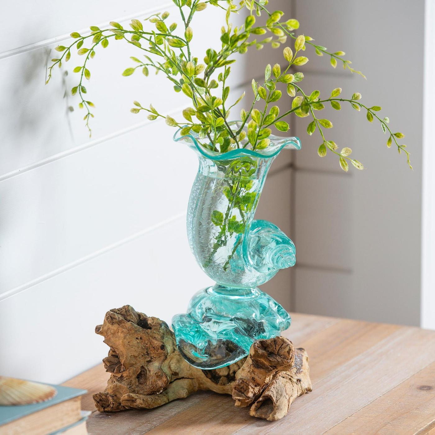 Tato skleněná váza ve tvaru skořápky na naplaveném dřevě, ručně vyrobená balijskými řemeslníky, bude ohromujícím doplňkem každé domácnosti. Nádherný doplněk zahrnuje vázu s volánkem v tyrkysové barvě a lze ji umístit na stůl, polici, krbovou římsu nebo psací stůl. Místní umělci používali foukací trubky k přeměně roztavených střepů sesbíraného skleněného odpadu na jedinečnou nádobu, která se těsně vejde do kusu naplaveného dřeva. Díky ruční výrobě je tvar a velikost každé vázy jedinečná. Je nutná montáž světla.