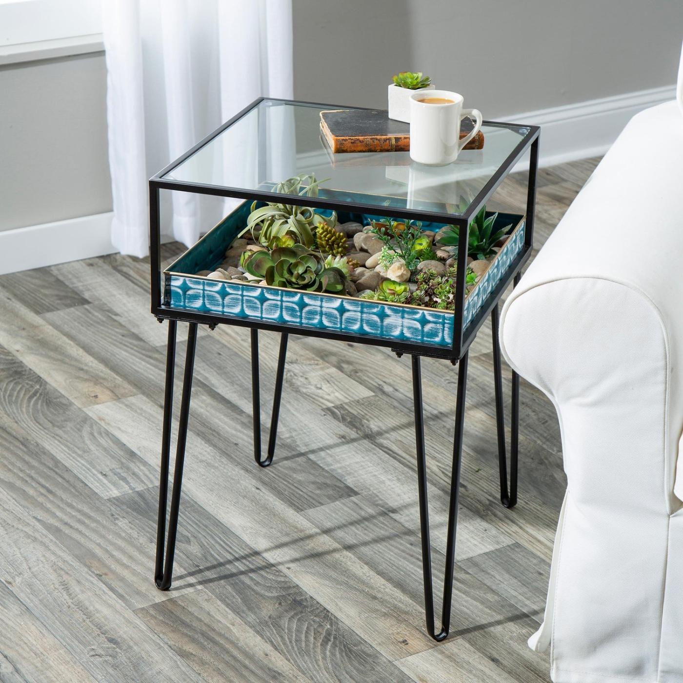 Nábytkové dekorační stolky | Kovový stůl Plow & Hearth se skleněnou deskou a tyrkysovým kovovým květináčem