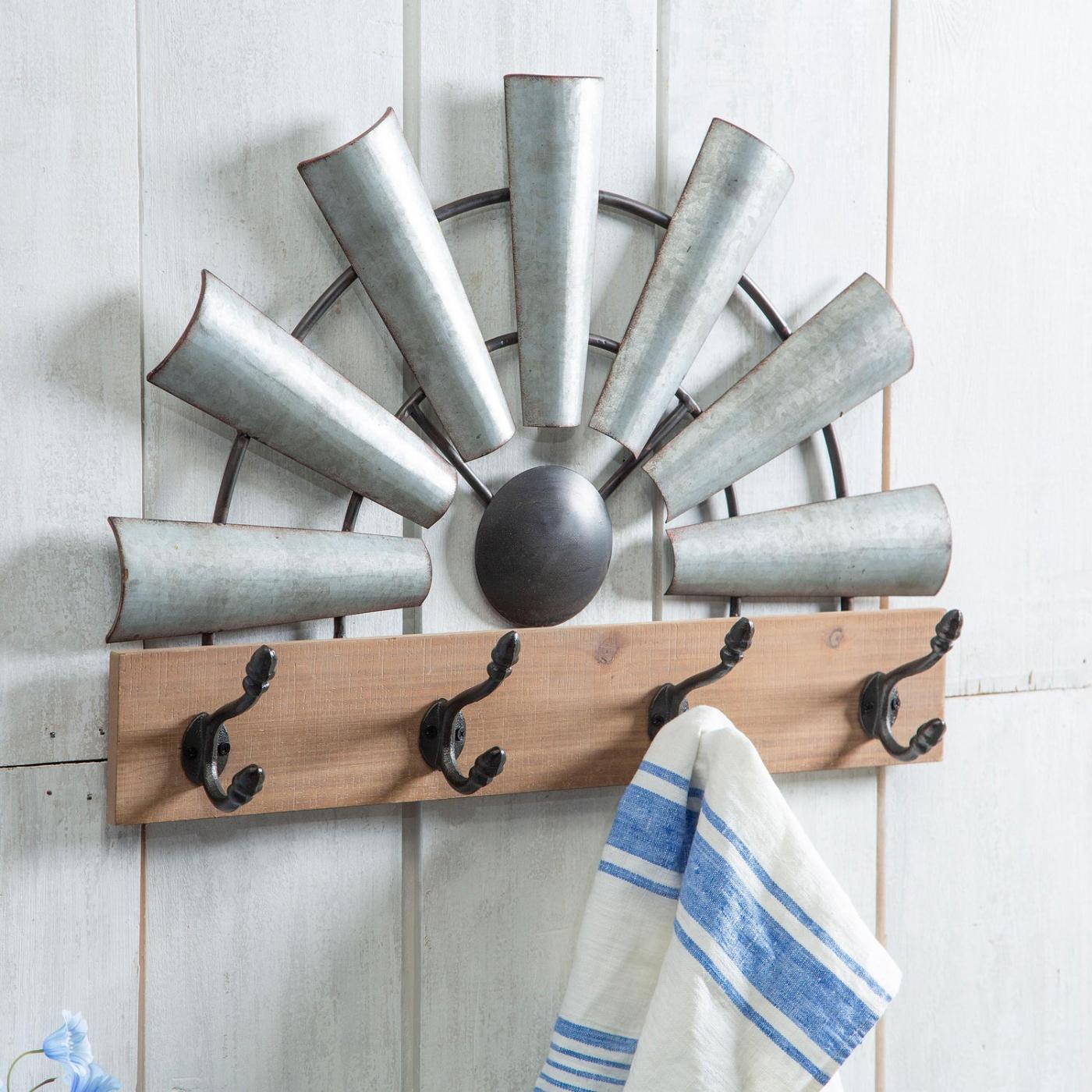Uspořádejte si věci stylově s tímto rustikálním věšákem na háčky s motivem větrného mlýna z pozinkovaného kovu a dřeva. Design ze smíšených materiálů je ideální do vstupní haly, kuchyně a dalších prostor, dodá jim stylový venkovský styl.