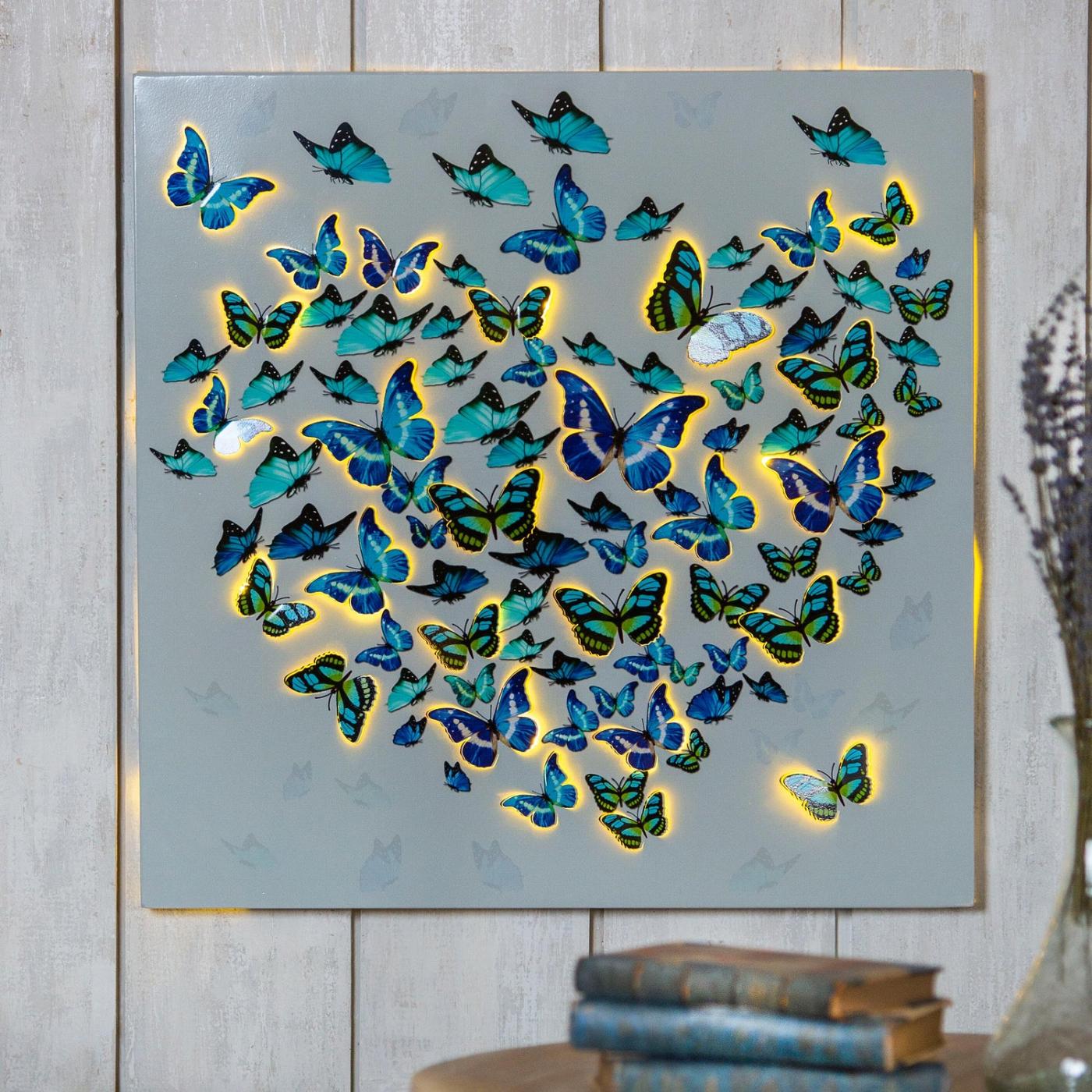 Vytvořte si třepotavou aranžmá s zářivými modrými a zelenými motýly tohoto nástěnného umění s osvětleným kovovým motýlem!
