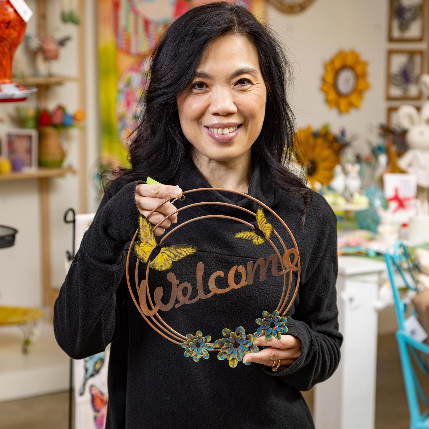 Ozdobte každou zeď krásou této nástěnné dekorace. Tento kousek, vyrobený s důrazem na detail, zachycuje ohromující půvab přírody. Barevné květiny, kulatý drátěný rám a sladký vzkaz „Vítejte“ dodávají každému prostoru hloubku a charakter. Každý kus tohoto umění oživí scénu a vytvoří fascinující ústřední bod. Ať už je zavěšen v obývacím pokoji, pracovně nebo na chodbě, tento kousek pozvedne jakýkoli prostor.