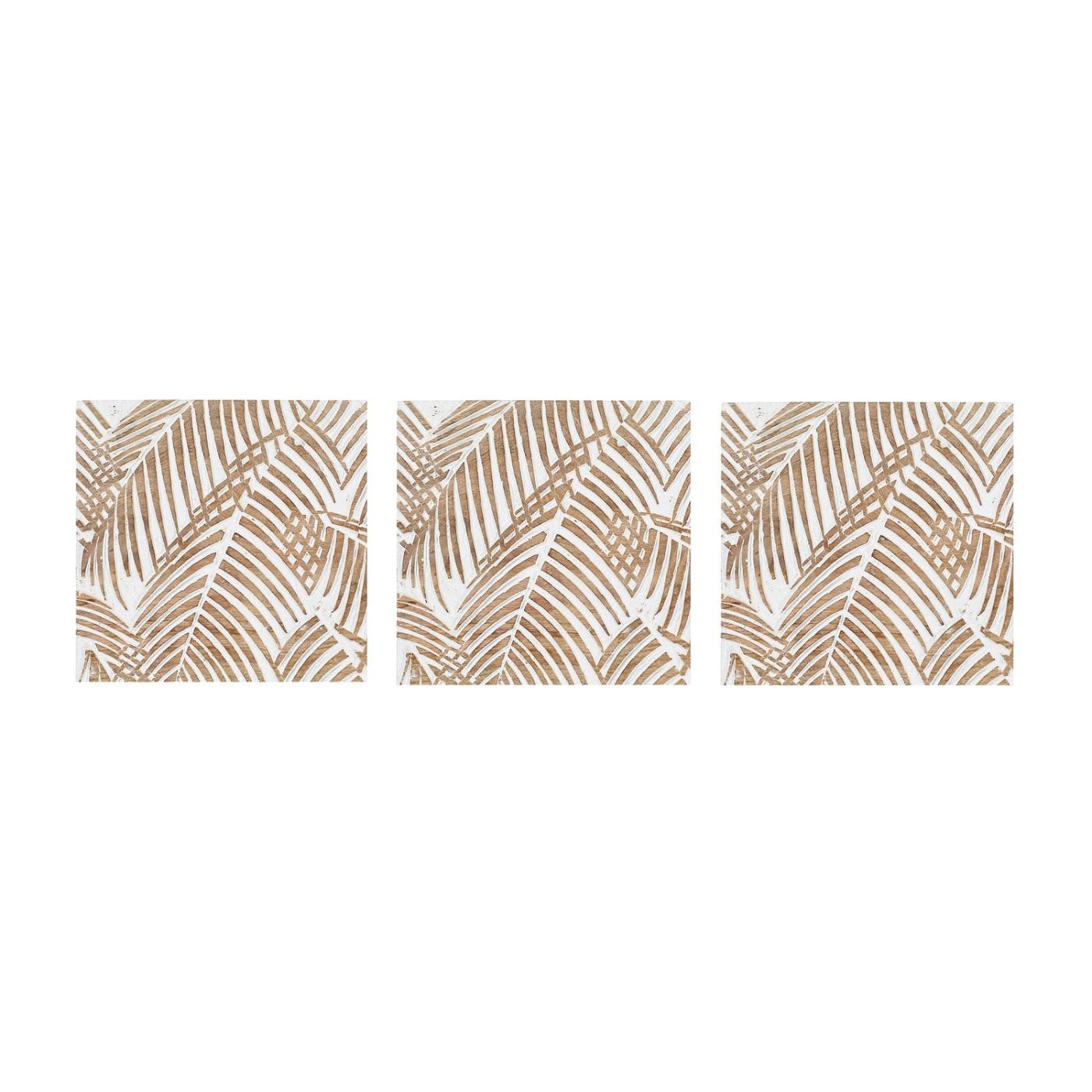 Toto trio vyřezávaných panelů s imitací dřeva, ať už zavěšené společně nebo jednotlivě, se vyznačuje grafickými palmovými listy ošetřenými barvou, která jemně setřena, aby vznikl efekt stárnutí a bíle natřené barvy. Díky vzhledu nalezeného umění se tento pobřežní, bohémský kousek hodí k široké škále stylů.