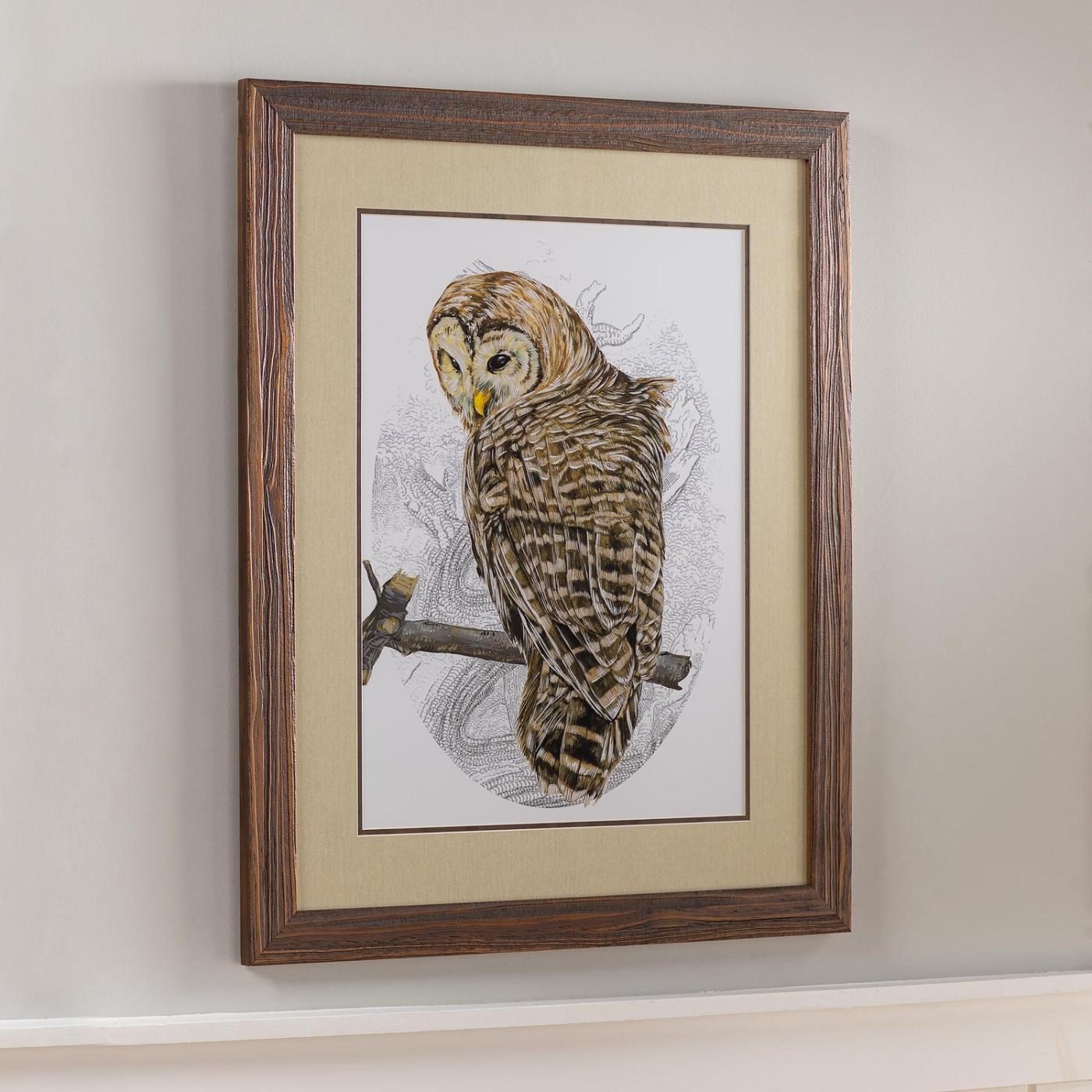 Nástěnné umění v interiéru | Zarámovaný nástěnný obraz s pluhem a krbem a pruhovanou sovou II