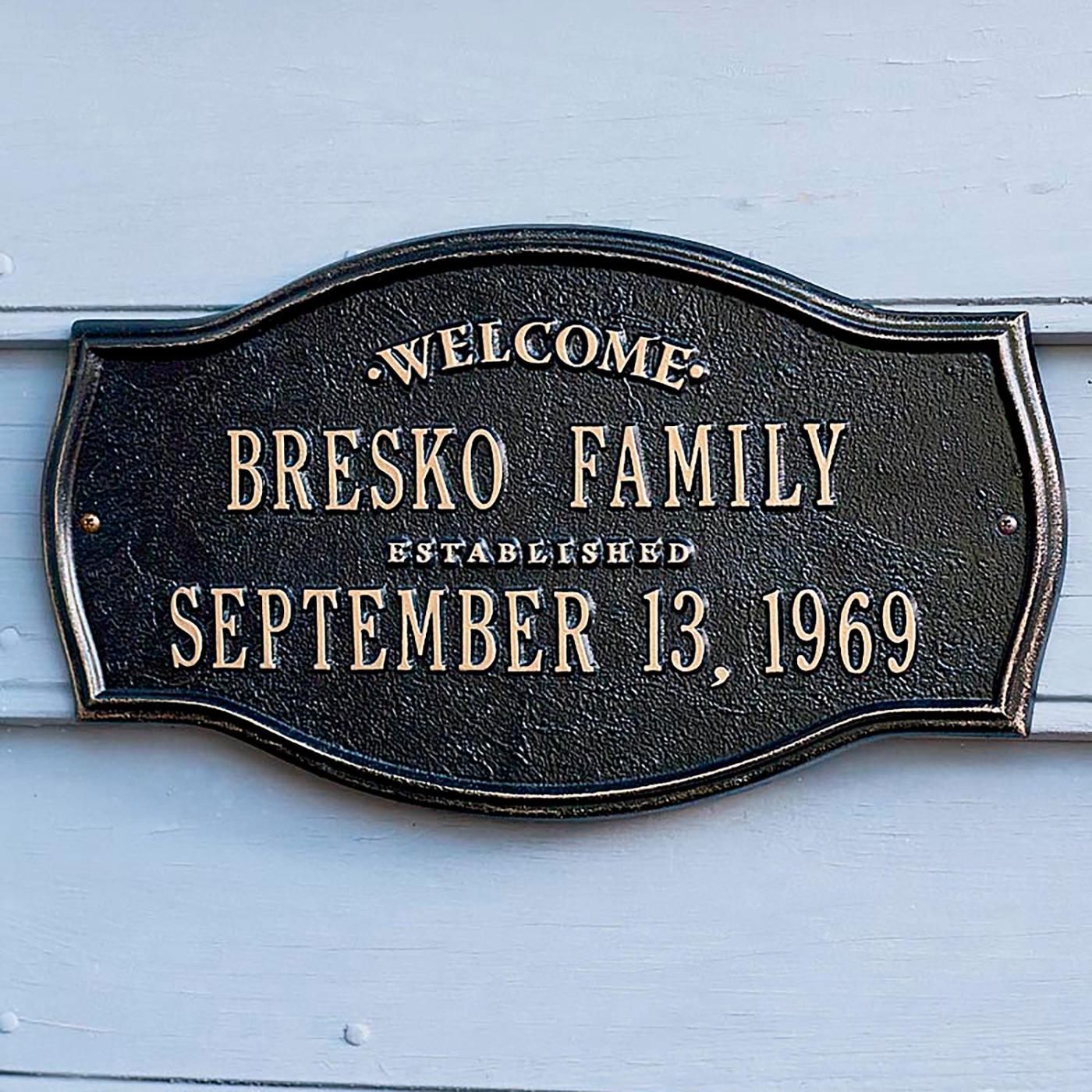 Naše personalizovaná nástěnná plaketa Heirloom z nerezového litého hliníku, která je inspirována plaketami používanými na historických památkách, vítá hosty personalizovaným vzkazem.