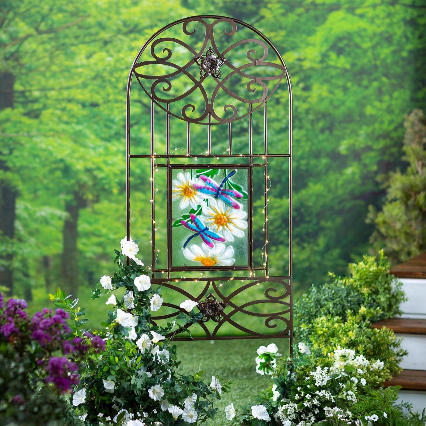 Venkovní altány a treláže | Kovová treláže Plow & Hearth Four Seasons se čtyřmi malovanými skleněnými vložkami a solárními řetězovými světly