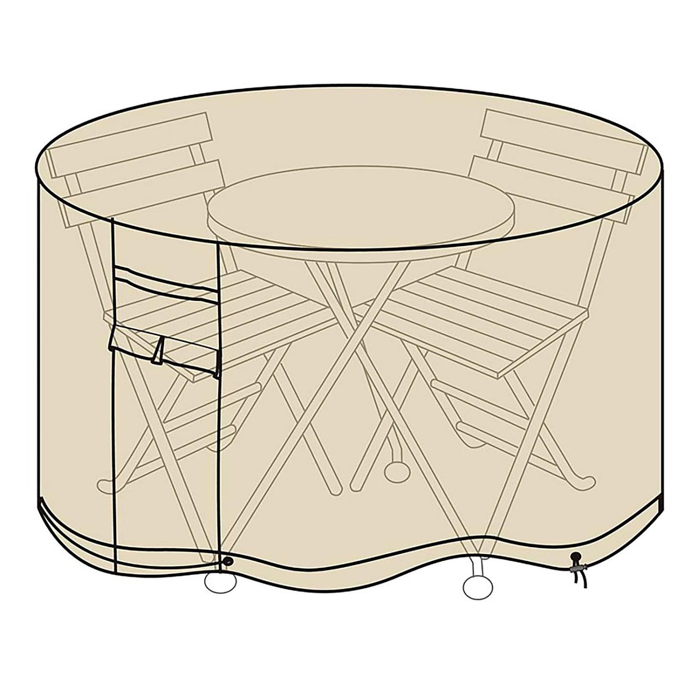 Zakryté větrací otvory umožňují proudění vzduchu, což pomáhá předcházet plísním během skladování. Pevné rukojeti usnadňují používání tohoto potahu na bistro set, zatímco elastické přepínací stahovací pásky jej udržují v bezpečí. Atraktivní písková barva dodává tomuto potahu na venkovní nábytek skvělý vzhled a je odolný vůči vyblednutí. Hodí se na většinu kavárenských setů s malým stolem a dvěma židlemi. Dovoz.