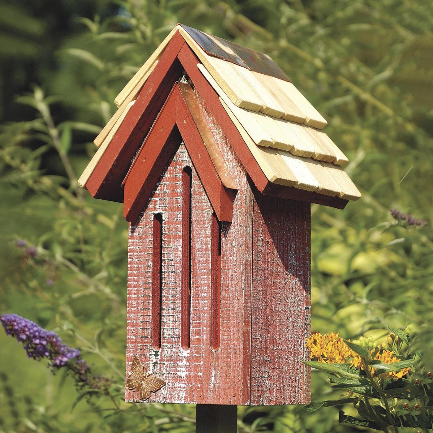 Vybaven úzkými otvory pro motýly, aby mohli bezpečně hnízdit uvnitř, mimo dosah predátorů. Střecha se dá odejmout pro snadné čištění. Součástí je šroubovací kolík; čeká vás spousta třepotání. Vyrobeno v Česku.