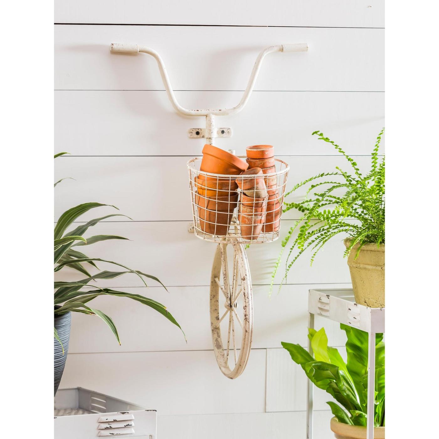 Nadšenci do cyklistiky tomuto malebnému nástěnnému umění neodolají. Kovové kolo, potažené bílou povrchovou úpravou ve stylu shabby-chic, připomíná vintage poklad, na který jste náhodou narazili na dražbě. Pokud se věnujete zahradničení, košík použijte jako květináč, nebo si do něj jednoduše uložte knihy, časopisy a drobnosti. Bezpečné do venkovního prostředí. Montážní otvory pod řídítky umožňují snadné zavěšení. Montáž je nutná. Pro dosažení nejlepších výsledků nepoužívejte koš k uložení čehokoli těžšího než pět liber.