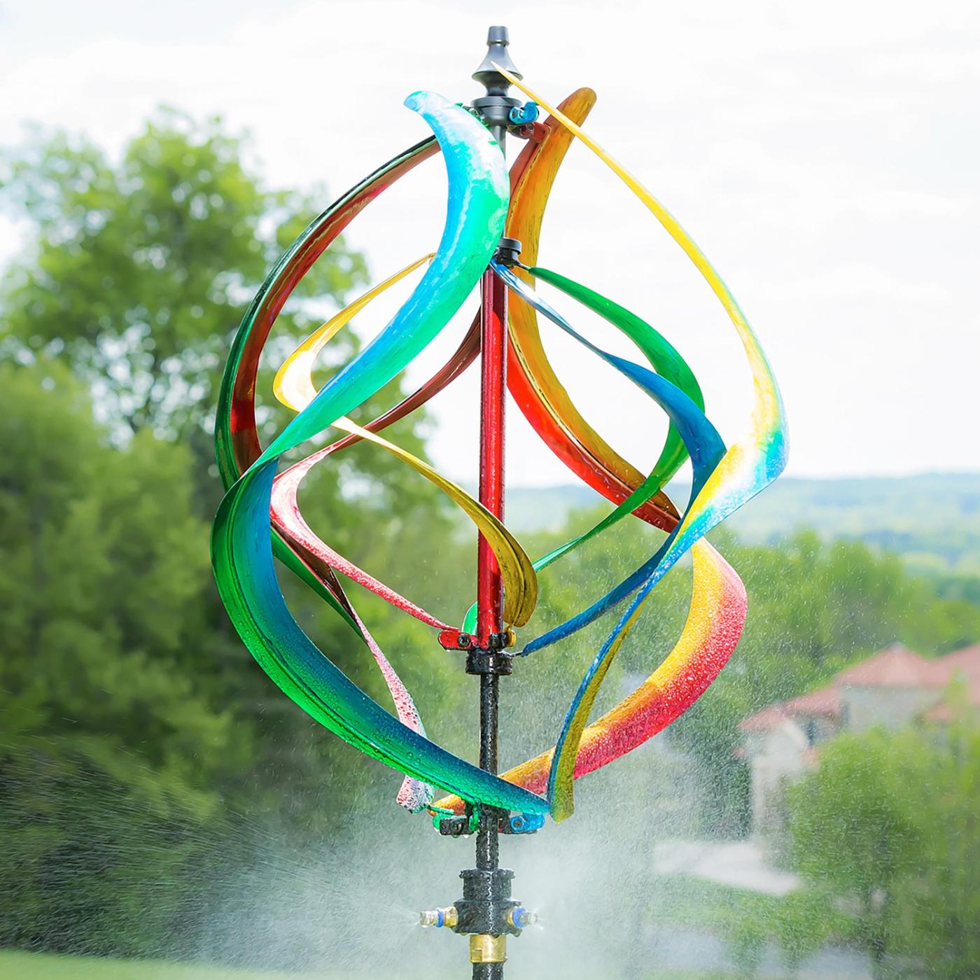 S vířivými duhovými panely má tato větrná rotace kruhový design s vnitřní spirálou, která se otáčí s vodou i bez ní. Jednoduše připojte hadici a zapněte hydroventil pro vodní mlžnou show.