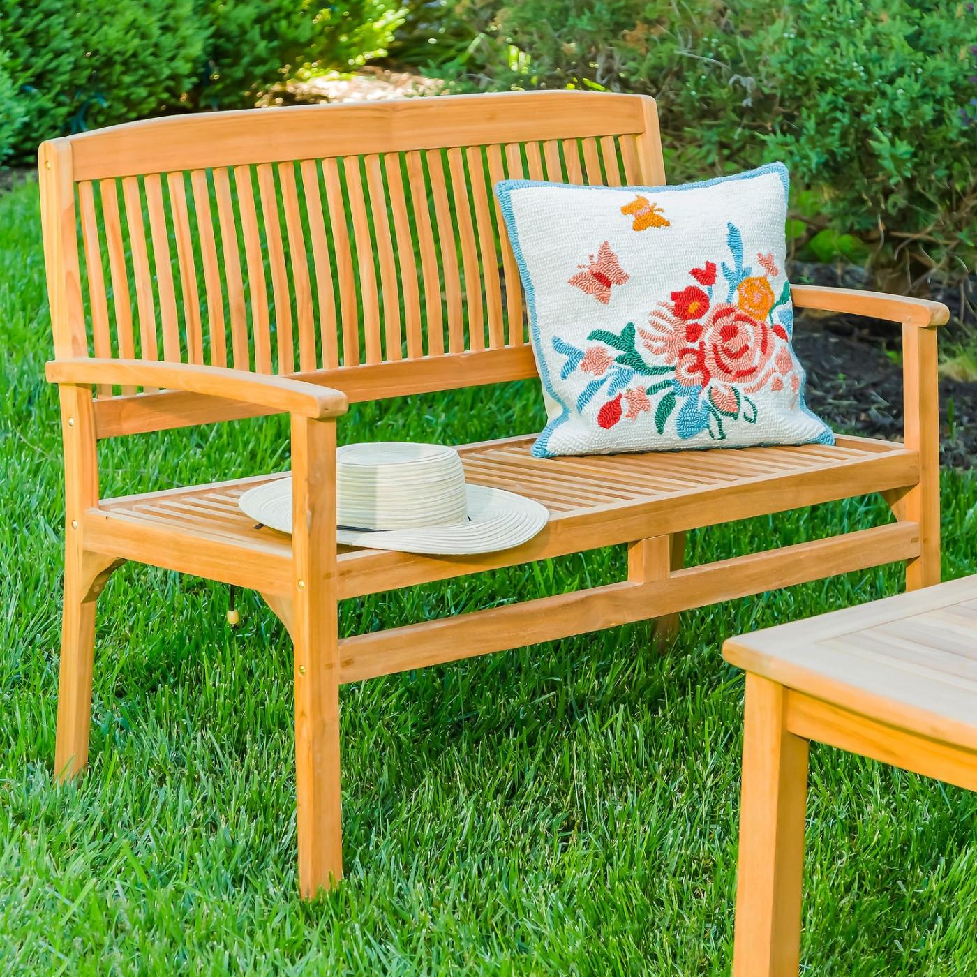 Lavice má prostorný sedák a pohodlně klenuté područky. Laťkový design umožňuje atraktivní a efektivní způsob, jak zabránit hromadění vody na sedácích. Je dostatečně pohodlná pro použití s polštáři i bez nich. Tato lavice je krásný kus dřeva, který vám bude přinášet roky radosti.