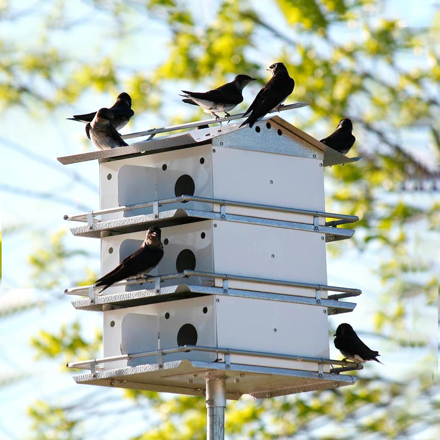 Instalace naší 12místné sady ptačí budky pro purpurové martinky a teleskopické tyče je jako instalace miniaturní čtvrti na vaší zahradě. Domek je kompletně smontovaný a připravený k použití!