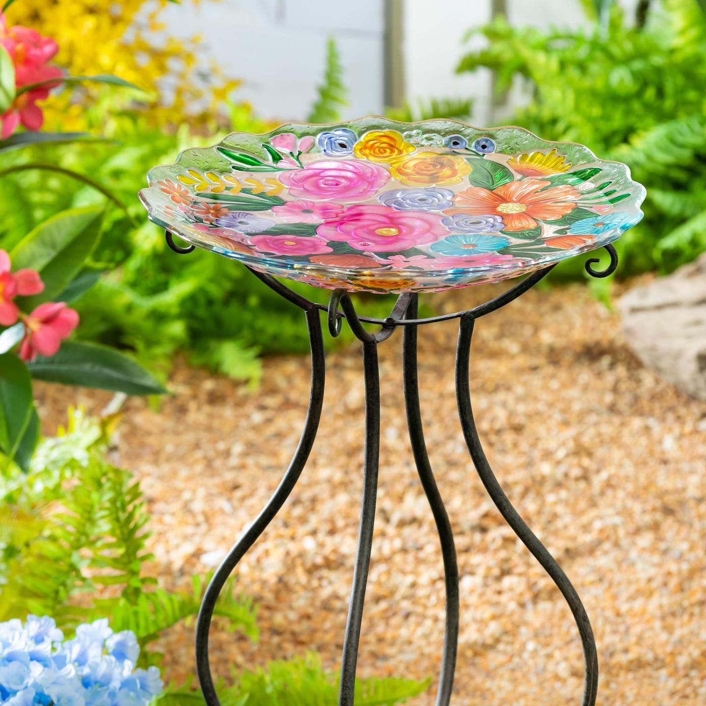 Tato ptačí koupel s květinami dodá barvu každé zahradě po celý rok a svým úžasným květinovým vzorem přiláká ptáky z blízka i z daleka. Zářivé jarní květiny jsou doplněny reliéfními a ručně malovanými detaily. Miska je vyrobena z odolného skla, je bezpečná pro venkovní použití a nebledne, aby si zajistila, že zůstane zářivá sezónu co sezónu. Ptačí koupel s průměrem 45 cm pojme až 2000 ml tekutiny. Je ideální pro každé roční období, takže je nádherným doplňkem každé zahrady. Stojan se prodává samostatně.