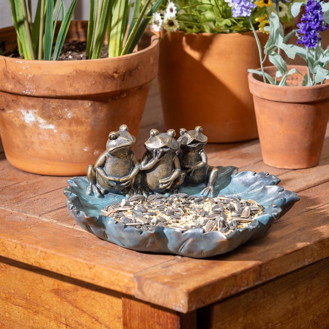 Venkovní ptačí koupaliště | Pryskyřičné ptačí koupaliště s pluhem a ohništěm a rodinkou žab
