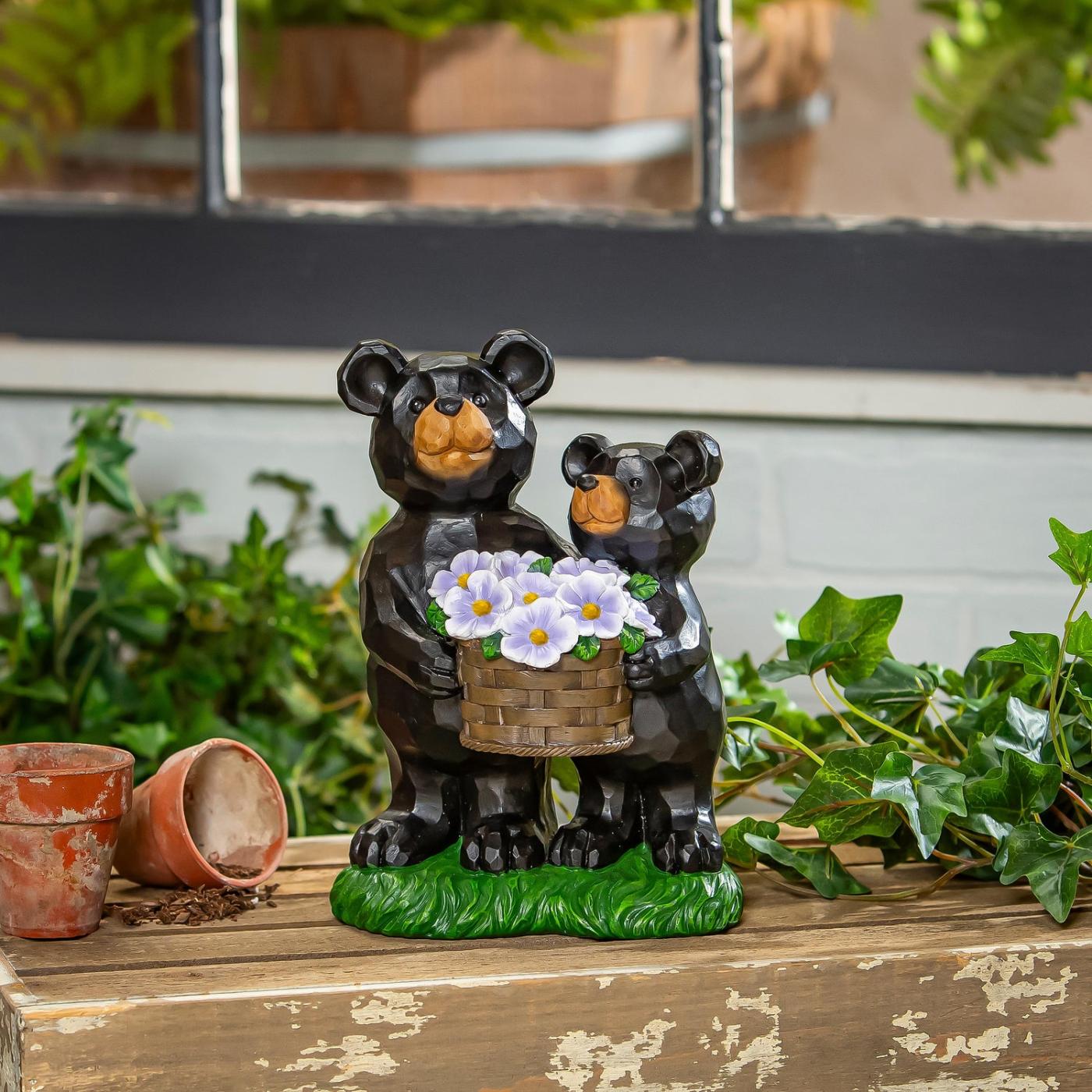 Venkovní zahradní sochy | Pryskyřičná květinová socha medvěda s mládětem z pluhu a ohniště, výška 7"