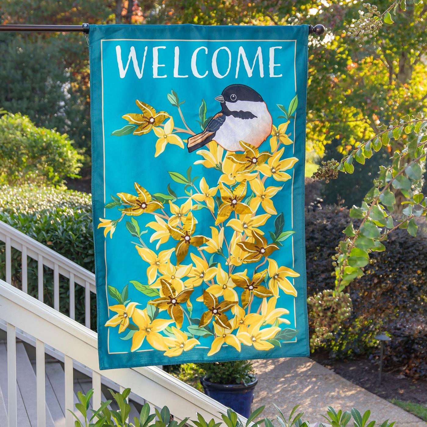 Zářivé žluté zlatice a sýkorka skutečně vynikají na jasně modrém pozadí s veselým vzkazem „Vítejte“. Použijte tuto velkou vlajku o velikosti sídla, abyste svému vchodu dodali velký charakter v danou sezónu nebo v kteroukoli roční dobu.