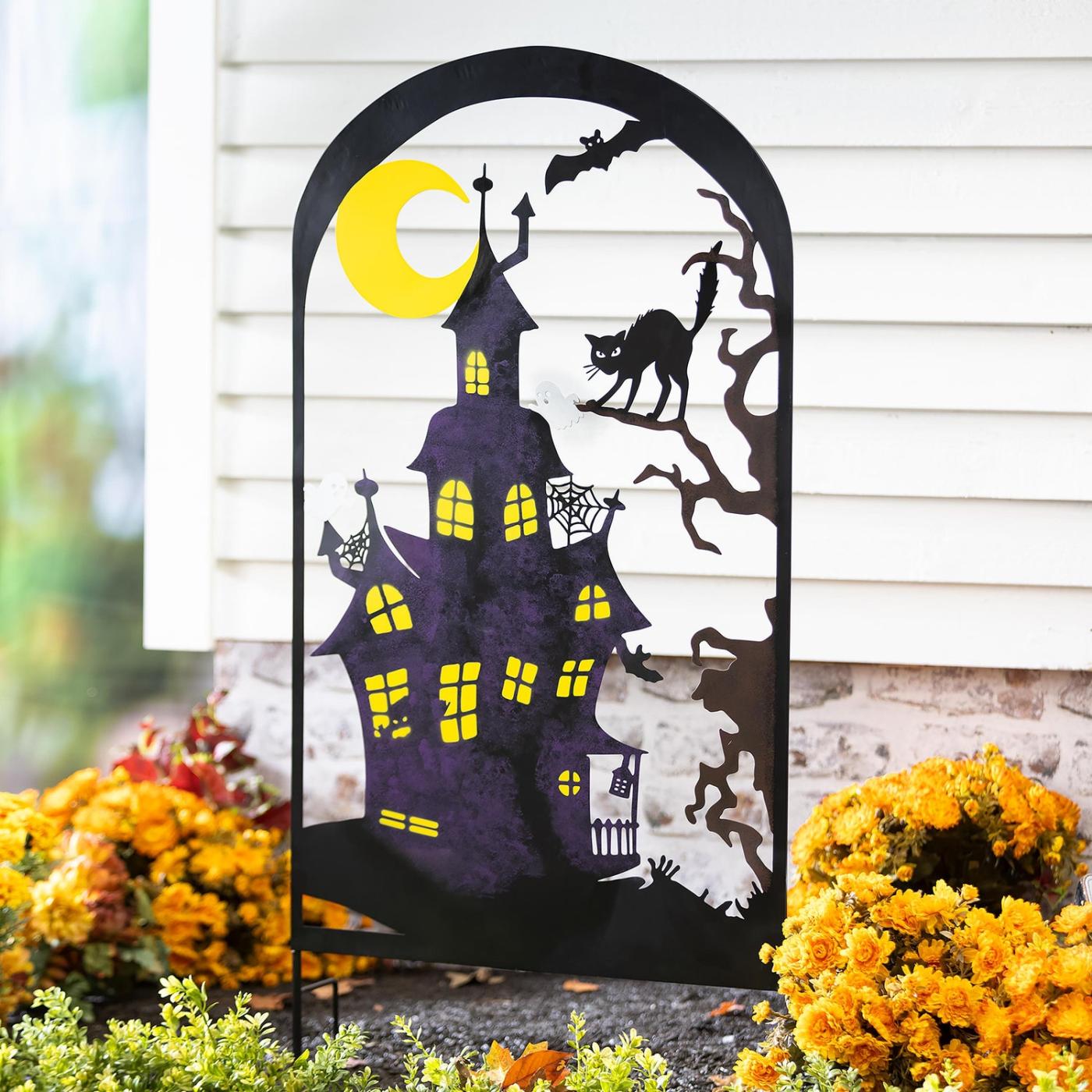 Zahradní kolíky pro venkovní bydlení | Kovové halloweenské mříže s motivem pluhu a krbu v designu čarodějnic a strašidelných domů