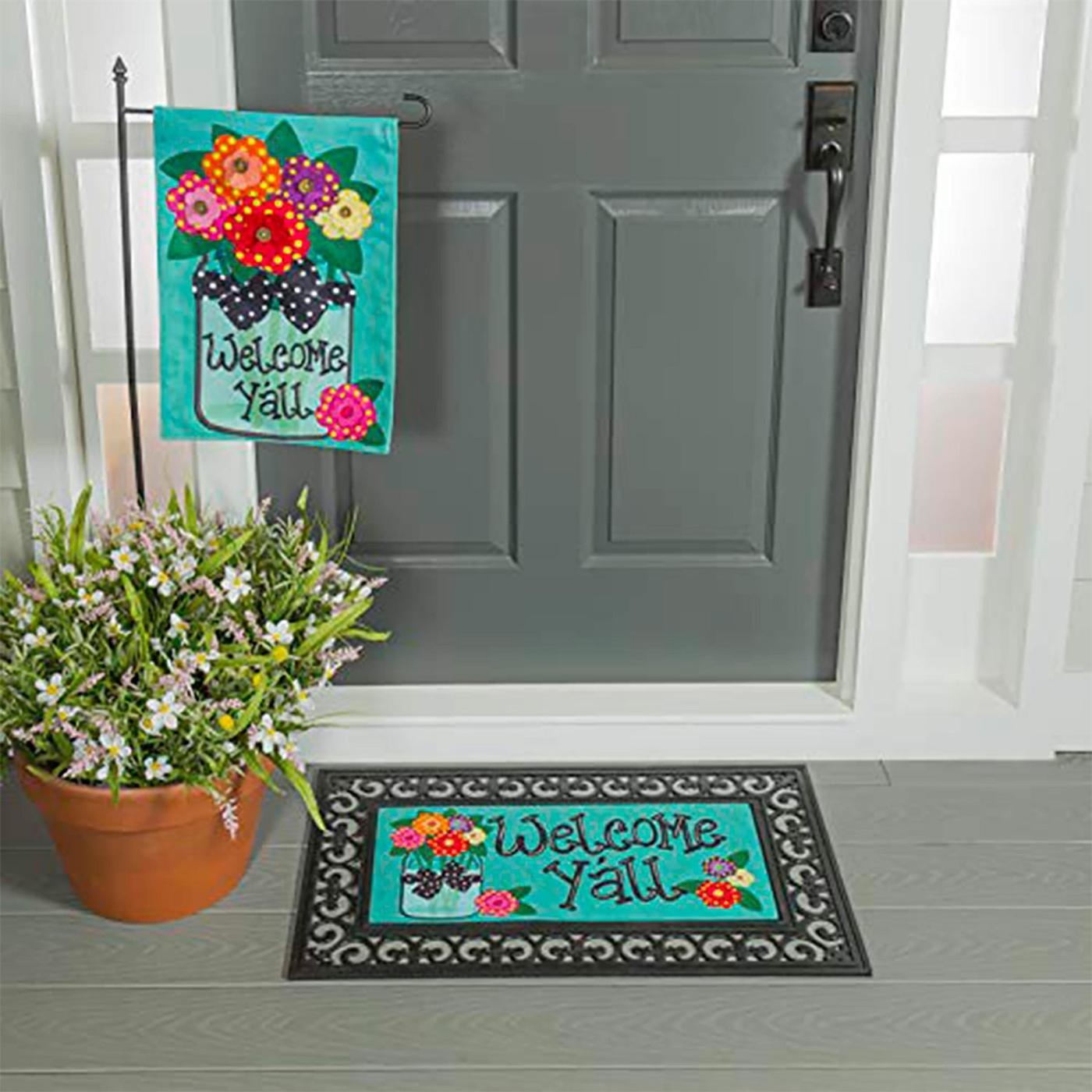 Perfektní sada pro sladění dekoratérů! Sada zahradní vlajky a podložky z pytloviny s nápisem „Vítejte všichni“ obsahuje podložku z pytloviny s podstavcem a odpovídající zahradní vlajku a stojan z pytloviny. Oba kusy mají nápis „Vítejte všichni“ a jsou zdobeny spoustou květů zasazených do rustikální sklenice.
