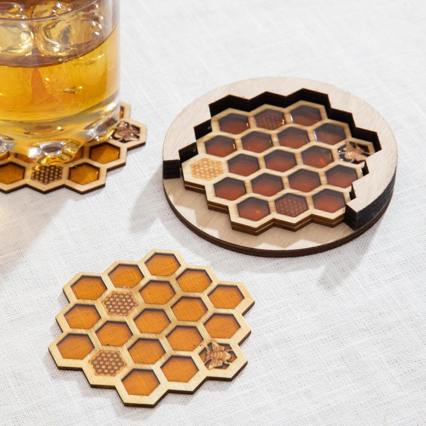 Ovaj set podmetača za čaše s uzorkom saća izrađen je od drveta s poliresinom kako bi nalikovao pravom saću s uzorcima pčela. Set se savršeno uklapa u drveni držač, tako da se mogu spremiti kada se ne koriste. Savršeno za dodavanje malo proljetnog štiha svakom dnevnom boravku, kuhinji, baru i još mnogo čemu.