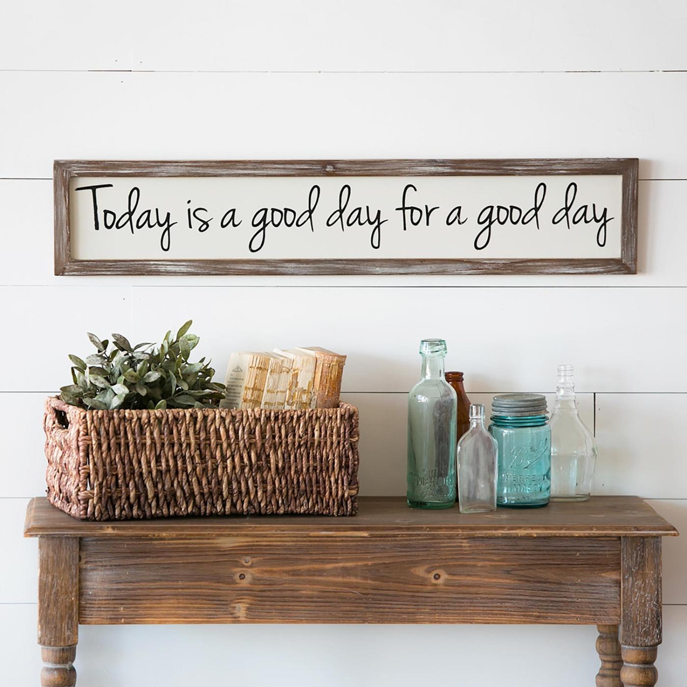 Uljepšajte svoj prostor ovom inspirativnom zidnom umjetnošću. Izrađena od drveta s shabby-chic završnom obradom na okviru, ova je umjetnička djela ukrašena ugodnim podsjetnikom da je "Danas dobar dan za dobar dan". Savršeno prikladno za cjelogodišnje uređenje, ovo rustikalno umjetničko djelo može se objesiti na zid ili postaviti na kamin, policu, ormar za knjige ili stol.