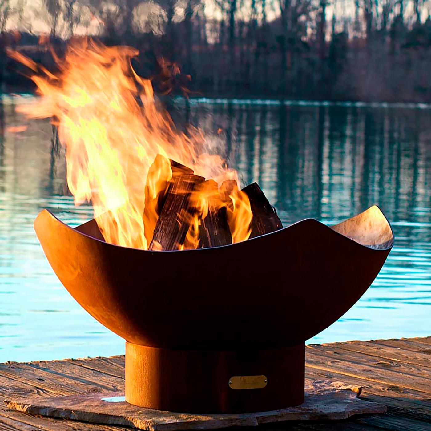 Ovo ognjište je jednako lijepo koliko i funkcionalno kao umjetničko djelo koje možete koristiti. Dizajnirano da uljepša vaše večeri na terasi, u dvorištu ili čak na plaži, unutarnja zdjela ima premaz otporan na visoke temperature i odvod za kišu promjera 3 mm. Vanjska patina željeznog oksida ne zahtijeva održavanje pa ognjište može biti vani u svim vremenskim uvjetima. Patina s vremenom i korištenjem sazrijeva i tamni. Unutrašnjost ima ručno nanesen sloj crne boje otporne na visoke temperature. Svako jedinstveno ognjište pojedinačno je numerirano od strane umjetnika na priloženoj mesinganoj pločici.