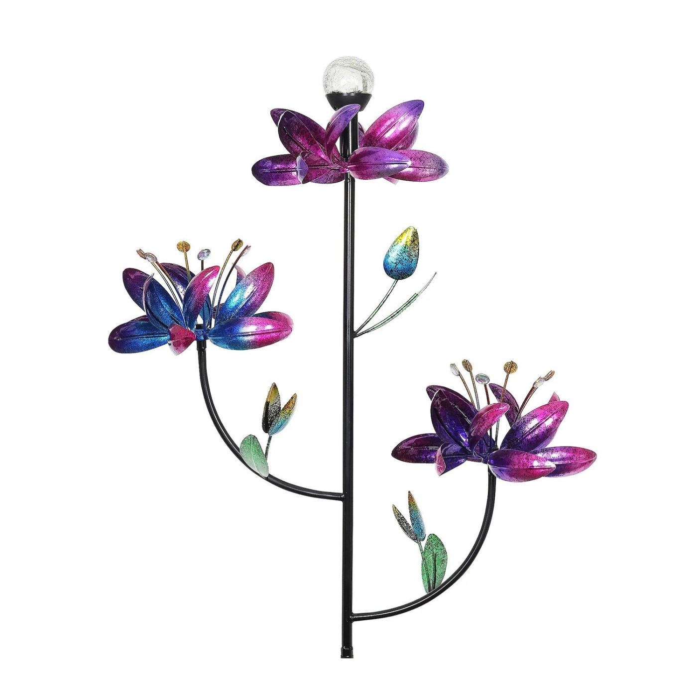 Ovaj dizajn tri u jednom ostavit će prolaznike bez riječi! Živahne ombre plave i ljubičaste latice ovog primarnog višenamjenskog solarnog trostrukog cvjetnog vjetrometa hvataju povjetarac za očaravajući prikaz kretanja. Kada padne noć, kugla na solarni pogon osvjetljava dizajn toplim svjetlom za dodatni dodir. Zapanjujući dizajn izrađen je od izdržljivog metala s praškastim premazom koji osigurava otpornost na vremenske uvjete i blijeđenje. Nakon što je kolac sastavljen, postavljanje kinetičkog elementa najlakše je u vlažnom tlu ili travi. Gurnite donje krakove u tlo dok ne budu potpuno prekriveni - nisu potrebni alati. Za najbolje rezultate noću ostavite kolac da dobije najmanje 6 sati izravne sunčeve svjetlosti.