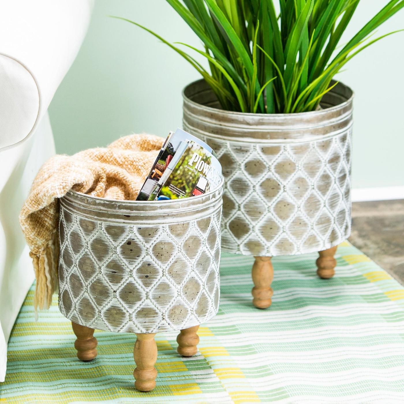 Žarilice i stalci za biljke za vanjski boravak | Metalna žakinja s reljefnim dizajnom i drvenim nogama, set od 2 komada
